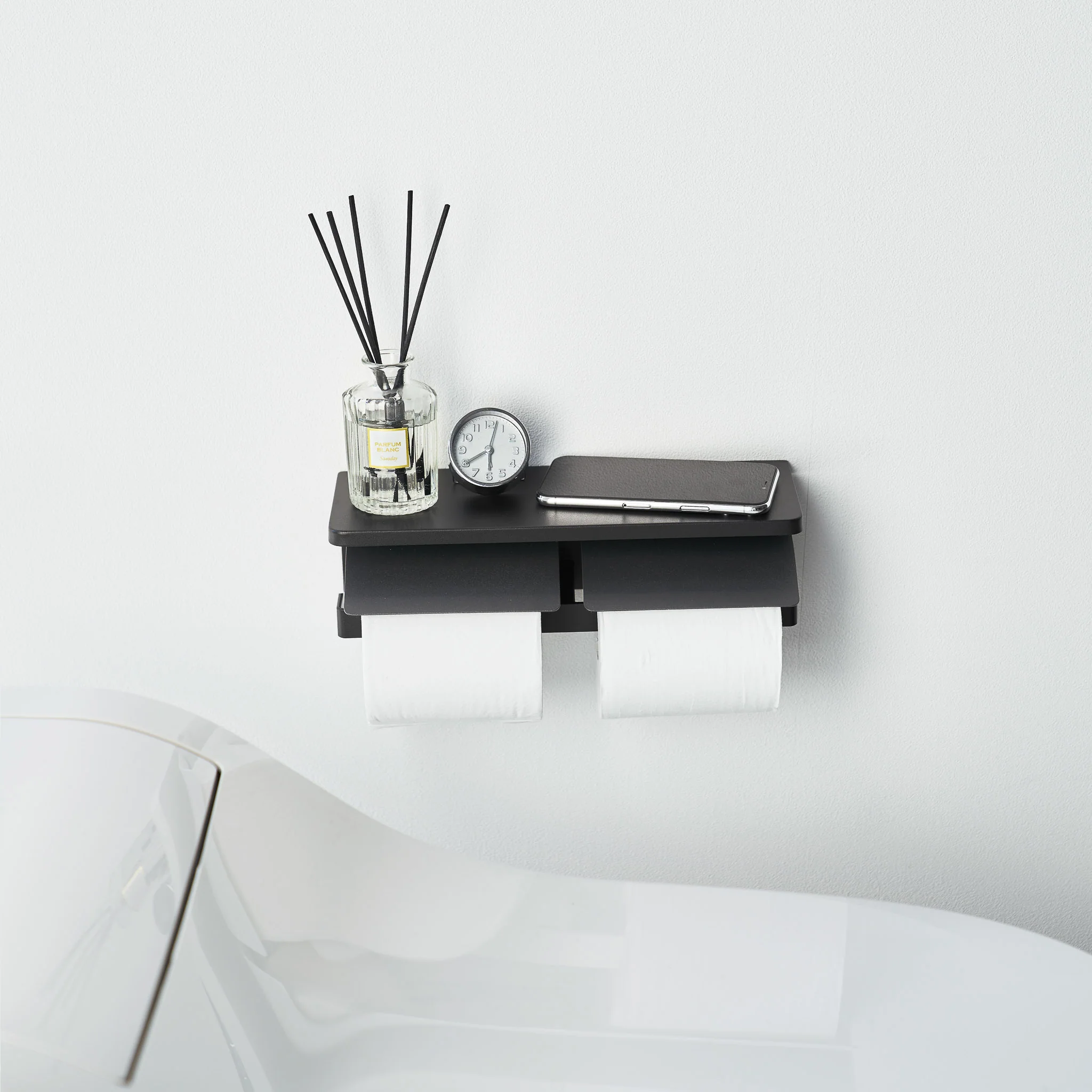This double toilet paper holder mounts to the wall using the included pins or screws, and its side loading design allows quick and easy roll replacement. The top surface provides space for small bathroom essentials or a phone.