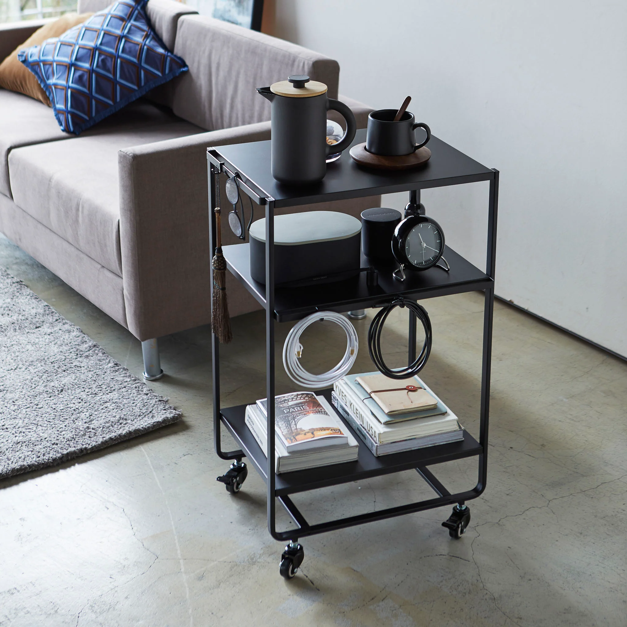 This storage wagon features three spacious tiers, making it perfect for adding extra storage to kitchens or living areas. Equipped with smooth-rolling wheels for easy mobility, it also includes hooks for additional hanging space.