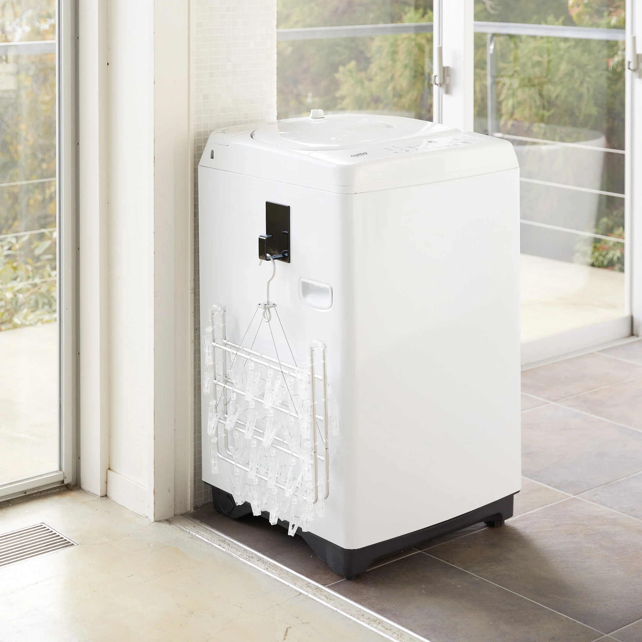 This hook attaches magnetically to a laundry machine or metal surface, offering versatile storage for a laundry basket or other essentials. It can be positioned vertically or horizontally, depending on the item or intended use.