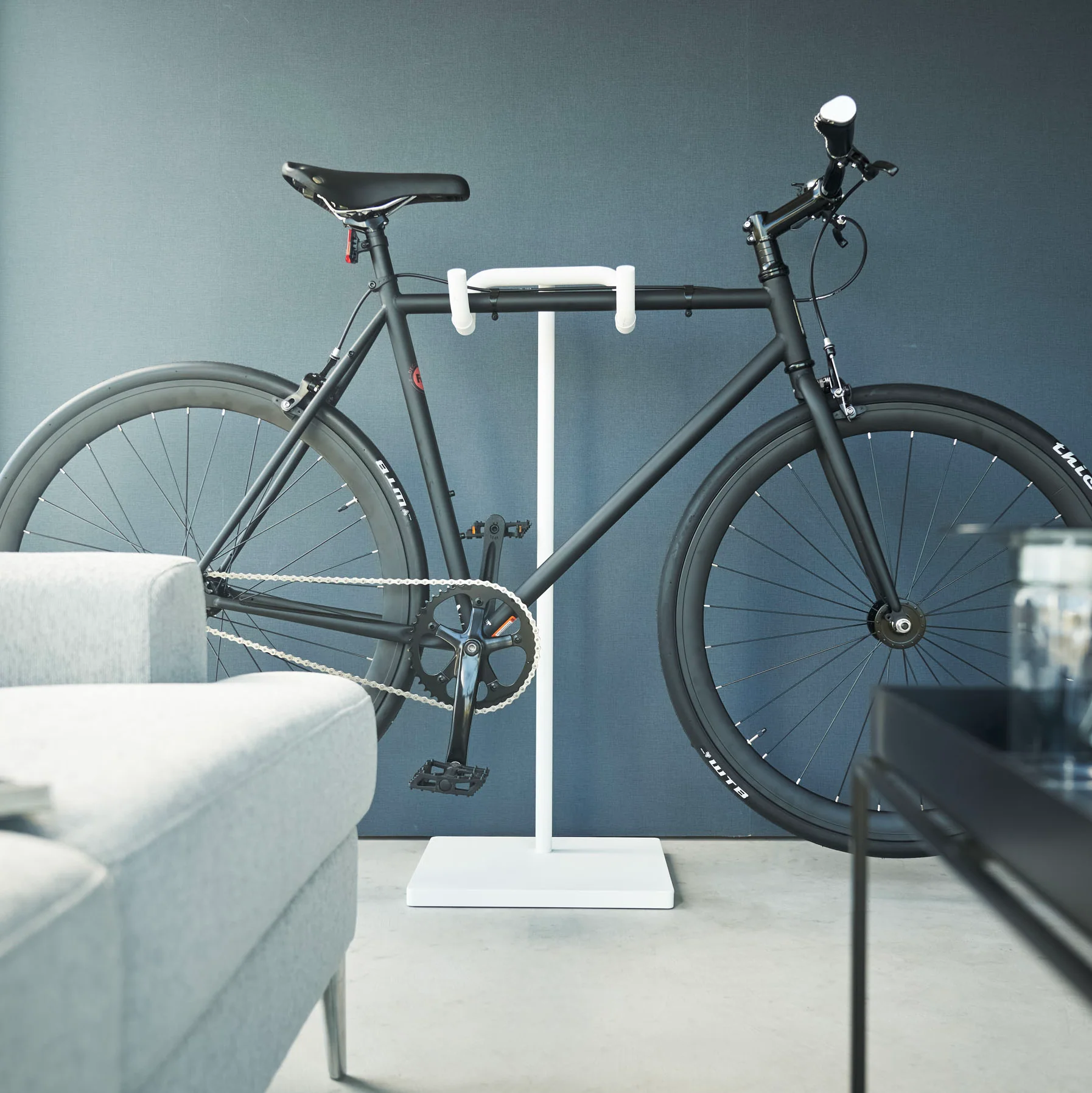 This stand offers a practical indoor storage solution for bikes. The holder features a silicone cover to prevent scratches, and its curved design not only secures the bike but also provides space to hang accessories like helmets.