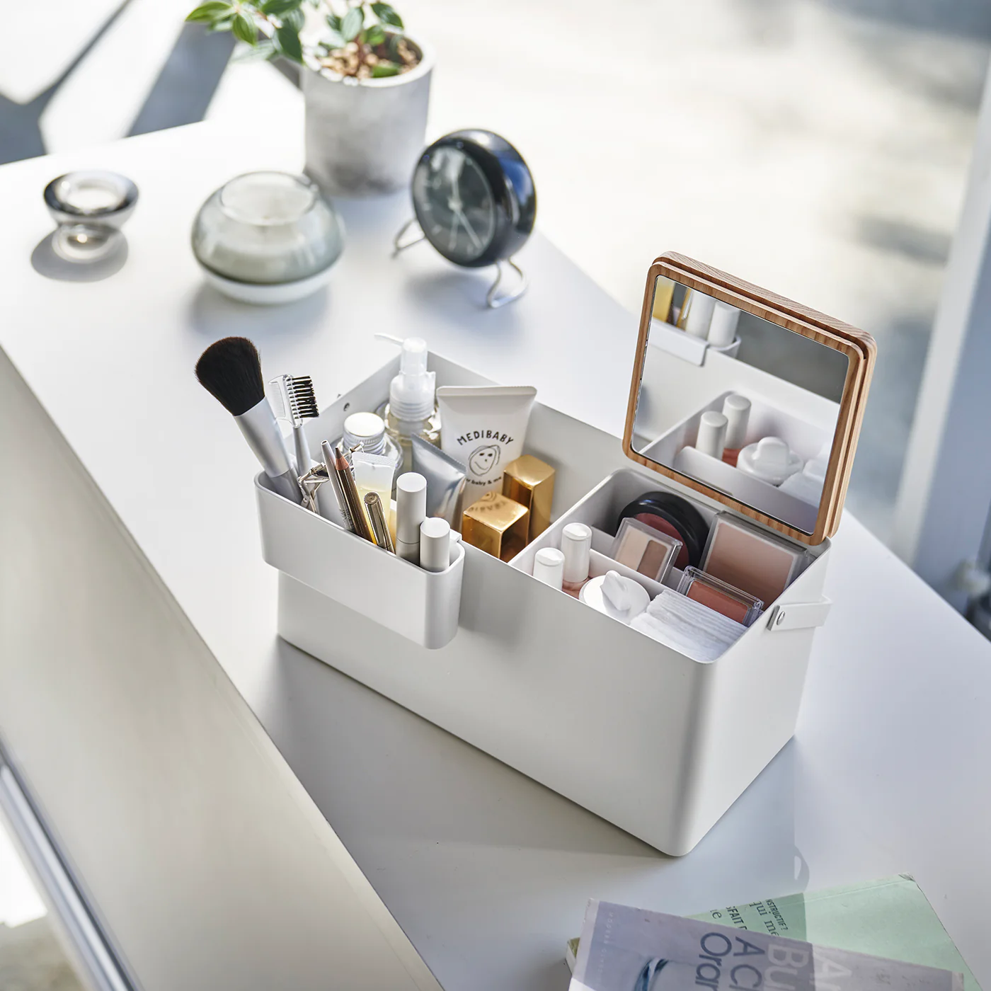 This box is designed with multiple compartments to easily organize all kinds of makeup essentials. It features a small wooden lid that conceals a mirror underneath, and the built-in handle ensures easy portability.