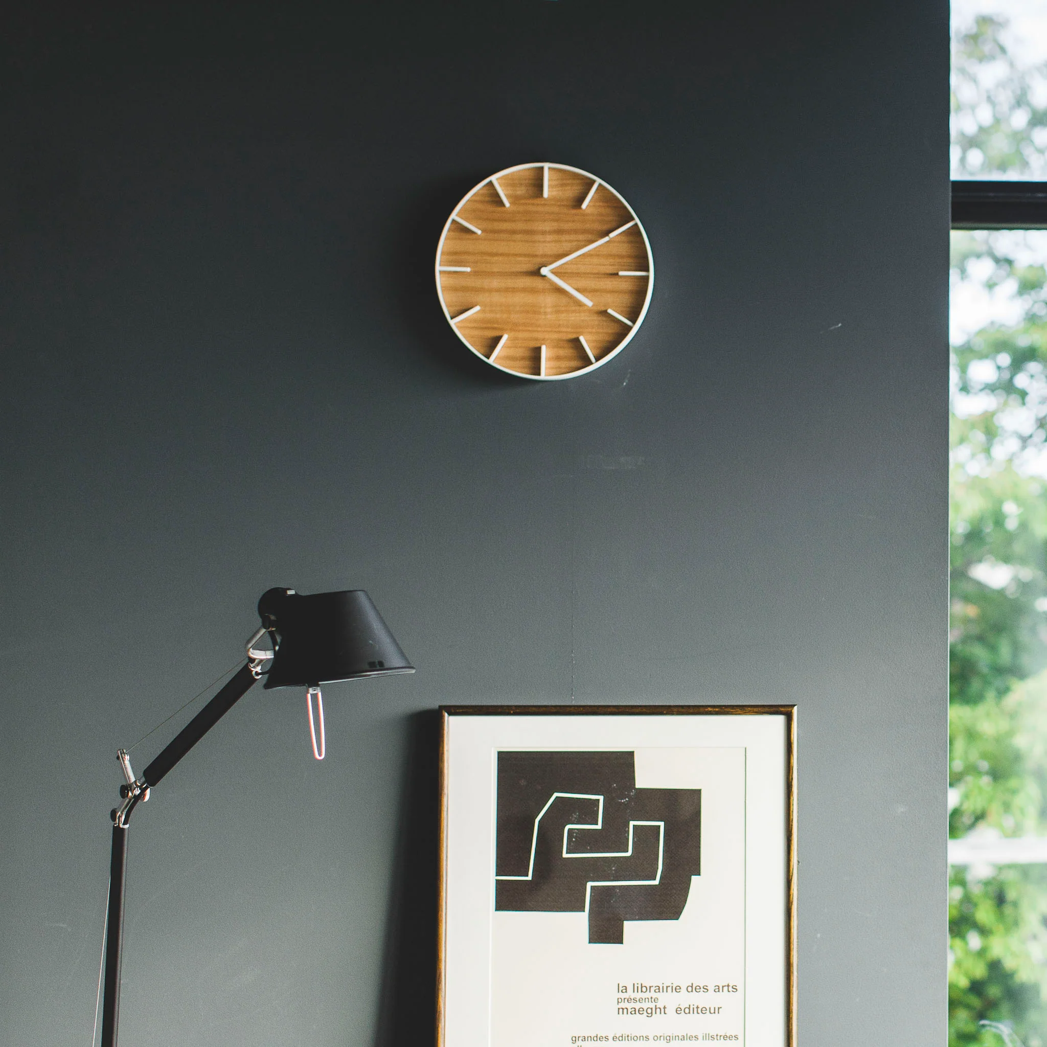 This wall clock features a minimalist design, making it a stylish and useful addition to any living or office space. It combines a sturdy steel frame with a warm wooden base and operates quietly to maintain a relaxing environment.