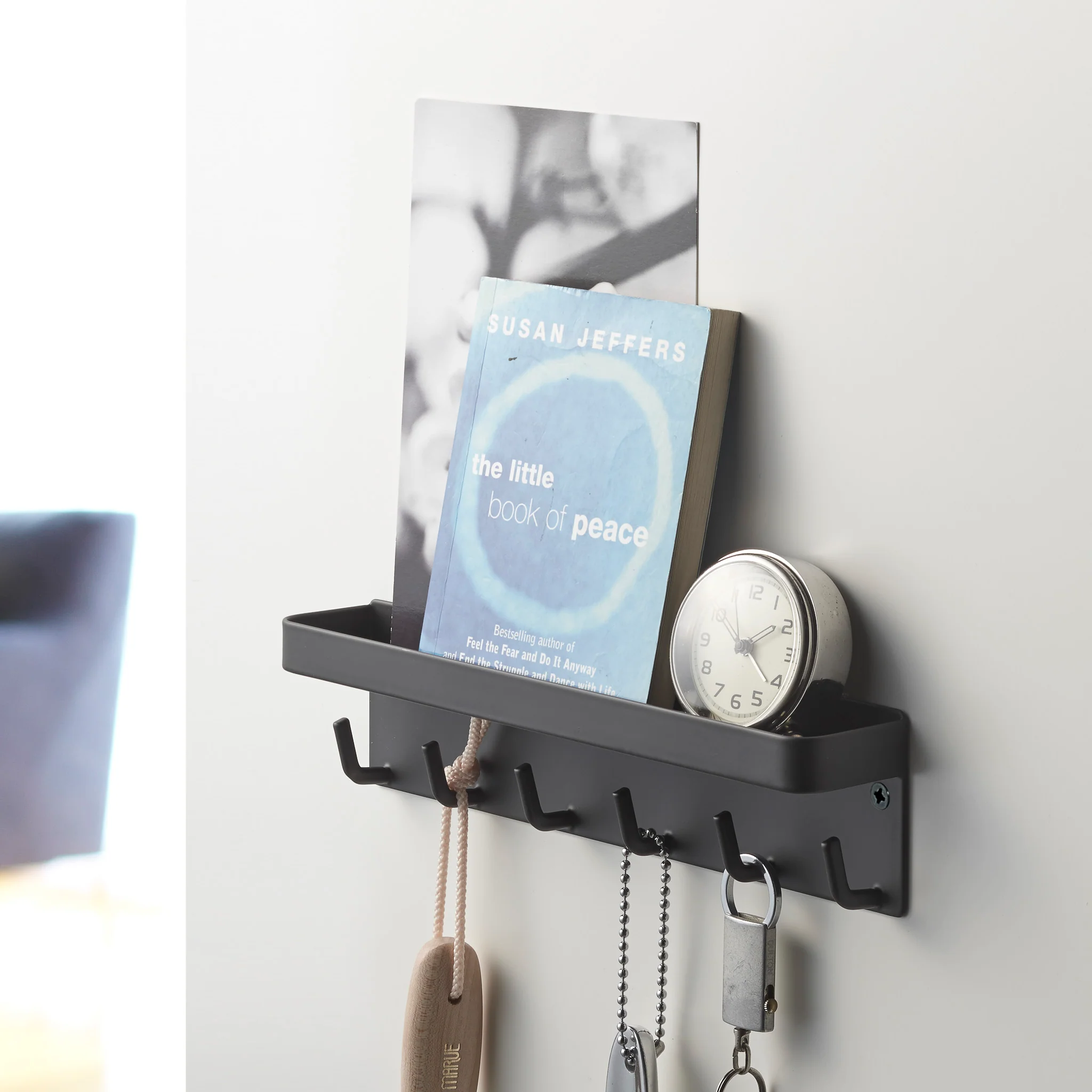 This key rack offers a space-saving solution for entryways. It installs easily with its magnetic backing or included screws and features multiple hooks and a small tray for organizing keys, umbrellas, and other essentials.