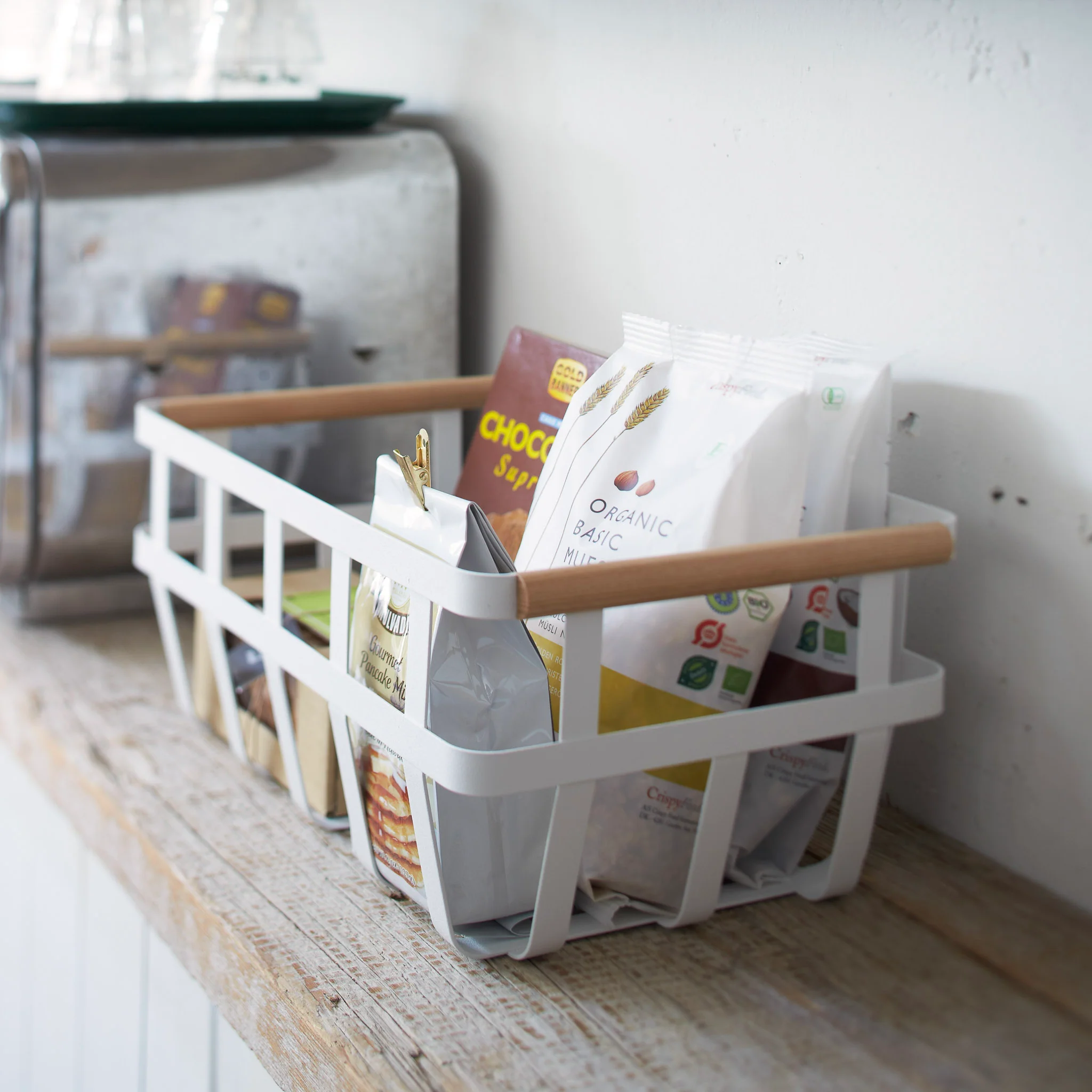This basket offers versatile storage, perfect for the pantry, kitchen, or organizing any other loose items throughout the home. Its sleek steel frame is enhanced by wooden handles, adding a warm and stylish accent.