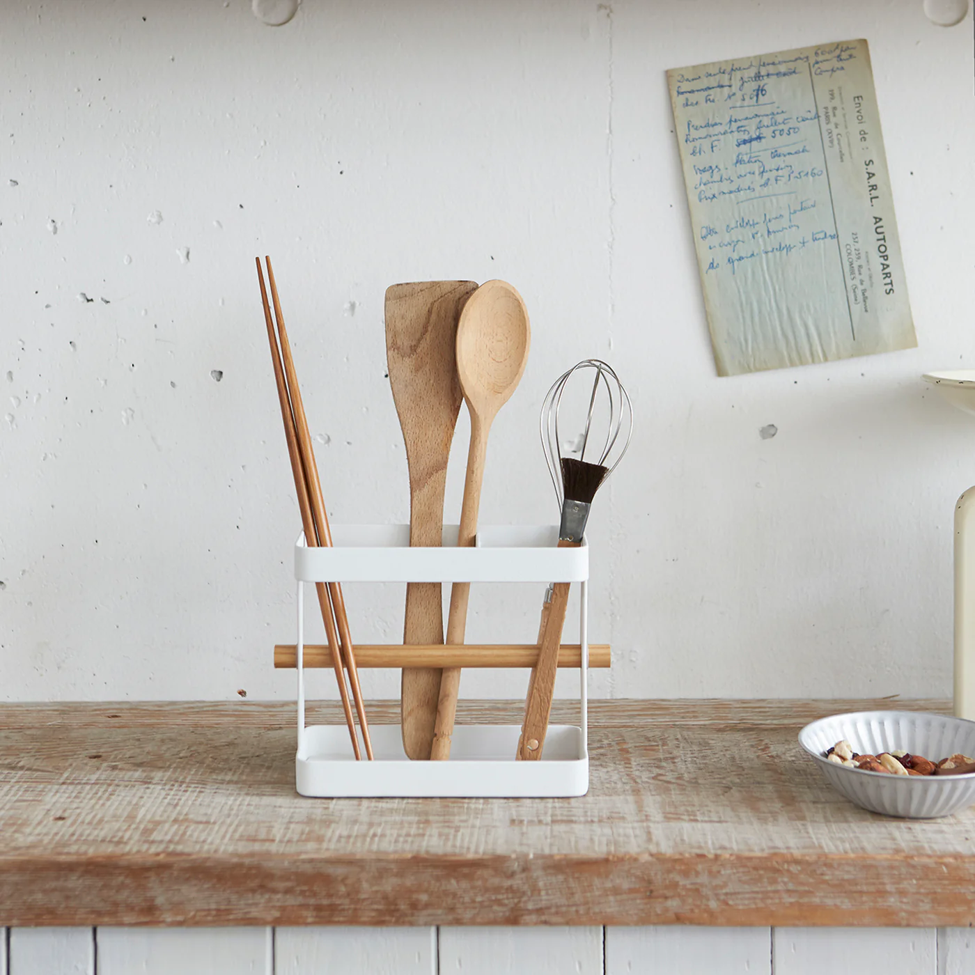 This stand is a practical addition to kitchens, providing space for storing frequently used utensils like spatulas and cooking spoons. With two compartments and a separating wooden bar, it ensures easy and organized storage.
