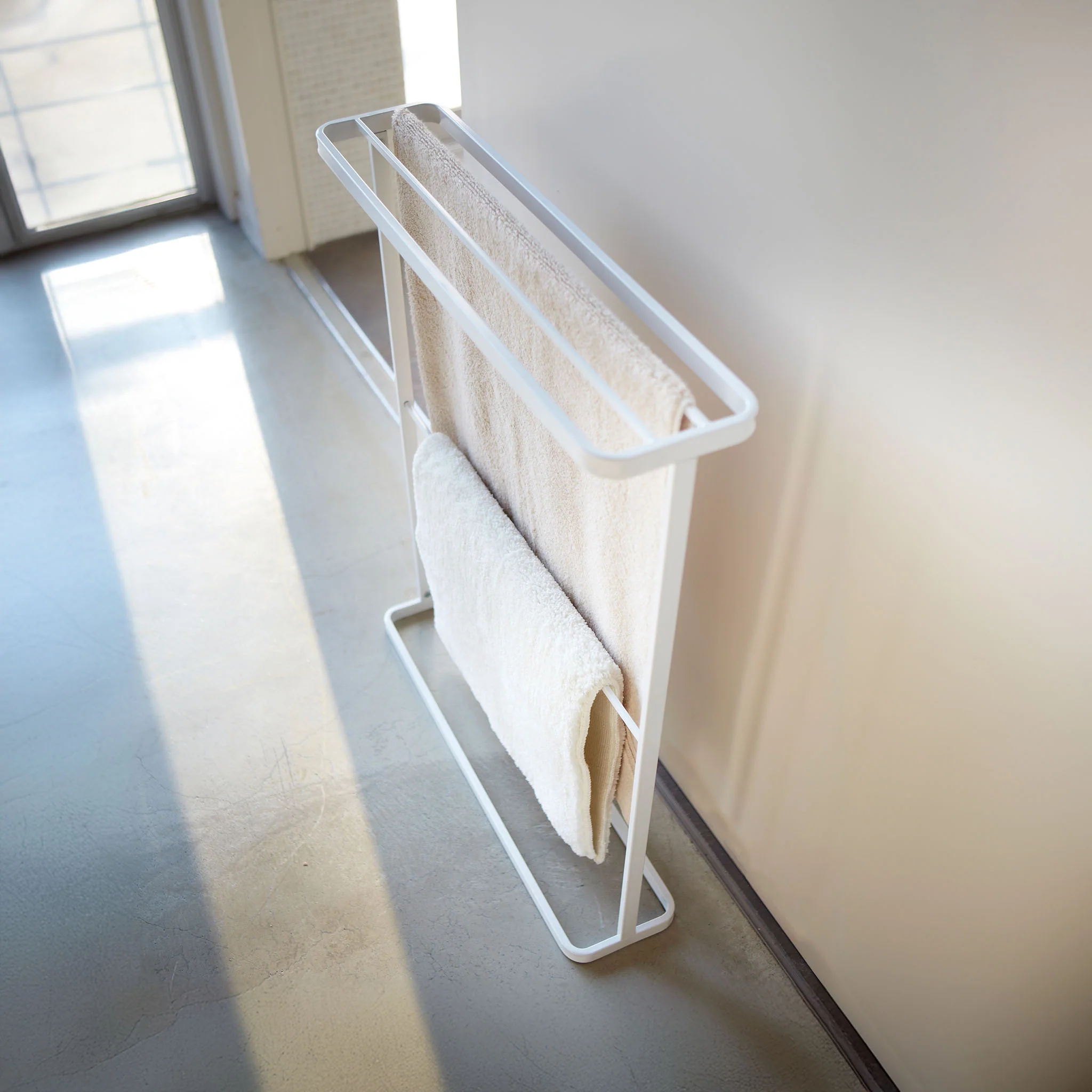 This bath towel hanger combines a modern aesthetic with practical functionality. It holds several towels and bath mats simultaneously on its upper and lower rails, and the slim design allows it to fit even into narrower bathrooms.