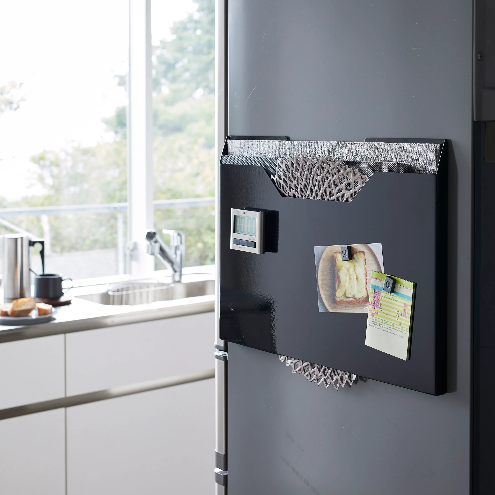 This storage case is ideal for storing placemats, keeping them clean and accessible. Made from steel, it features a magnetic back for attachment to metal surfaces like refrigerators but also includes screws for wall mounting.