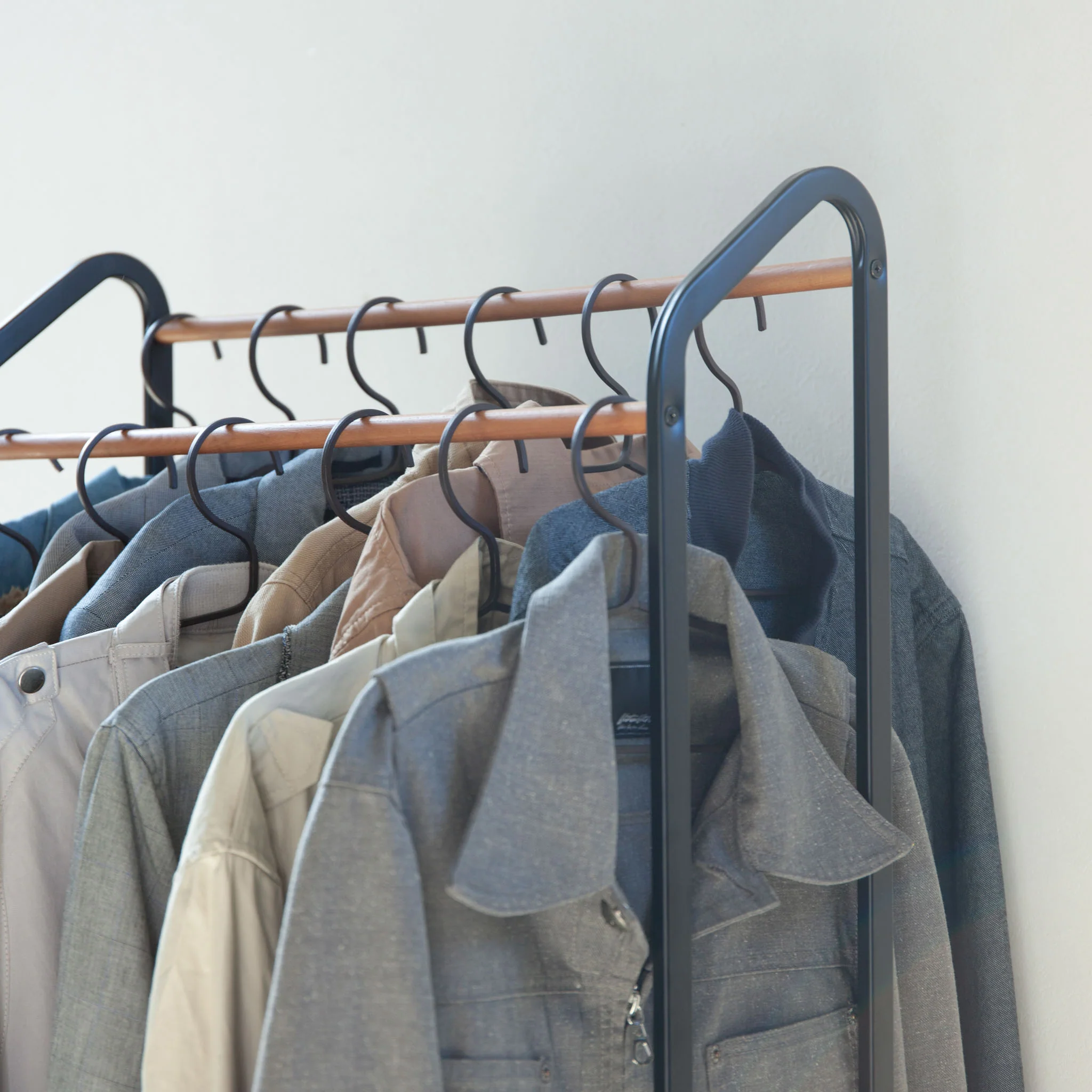 This coat rack is an ideal solution for maximizing space. It features two wooden bars for hanging clothes and is equipped with casters for easy mobility. The wire shelf at the bottom offers additional storage for bags and shoes.